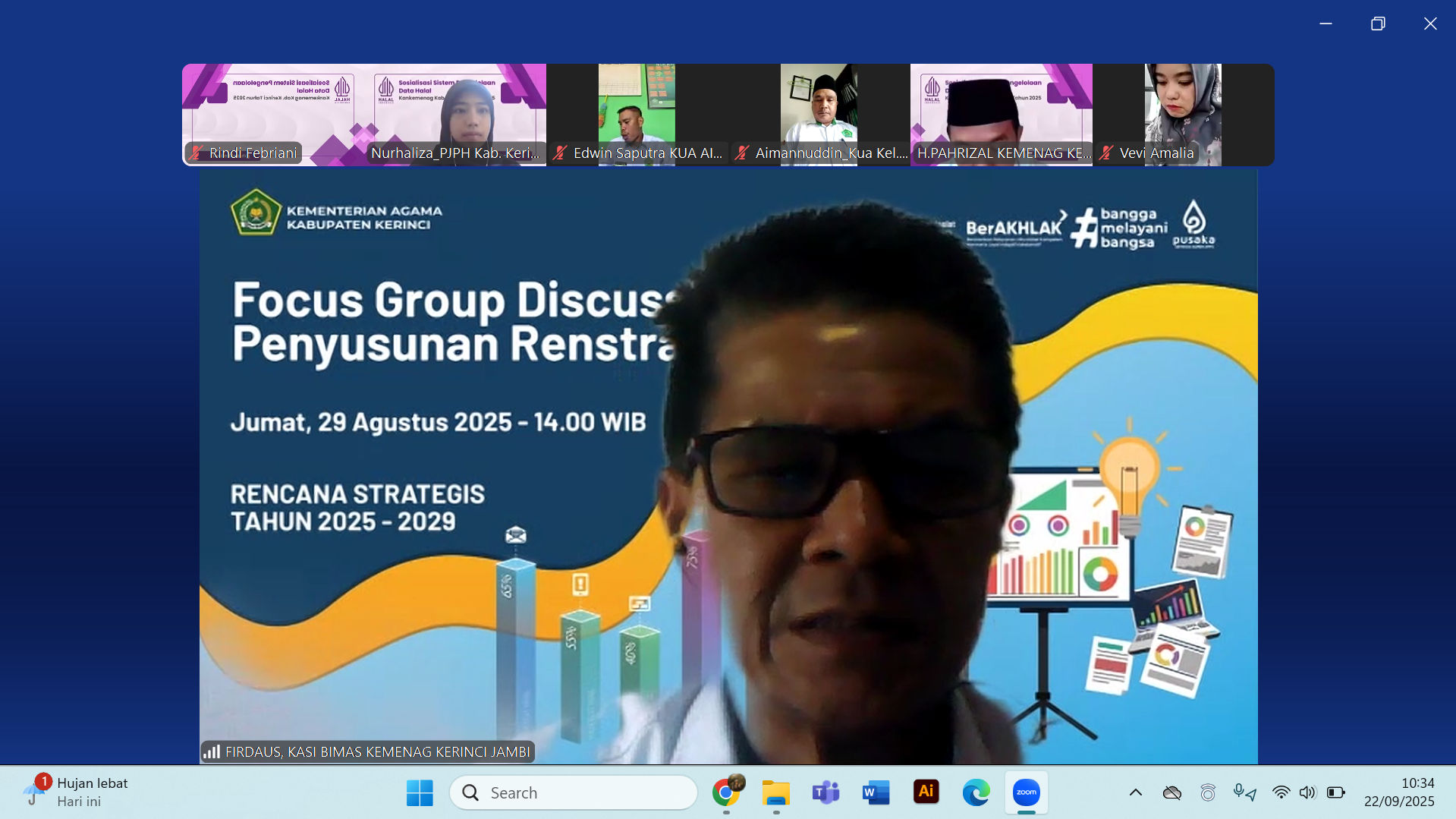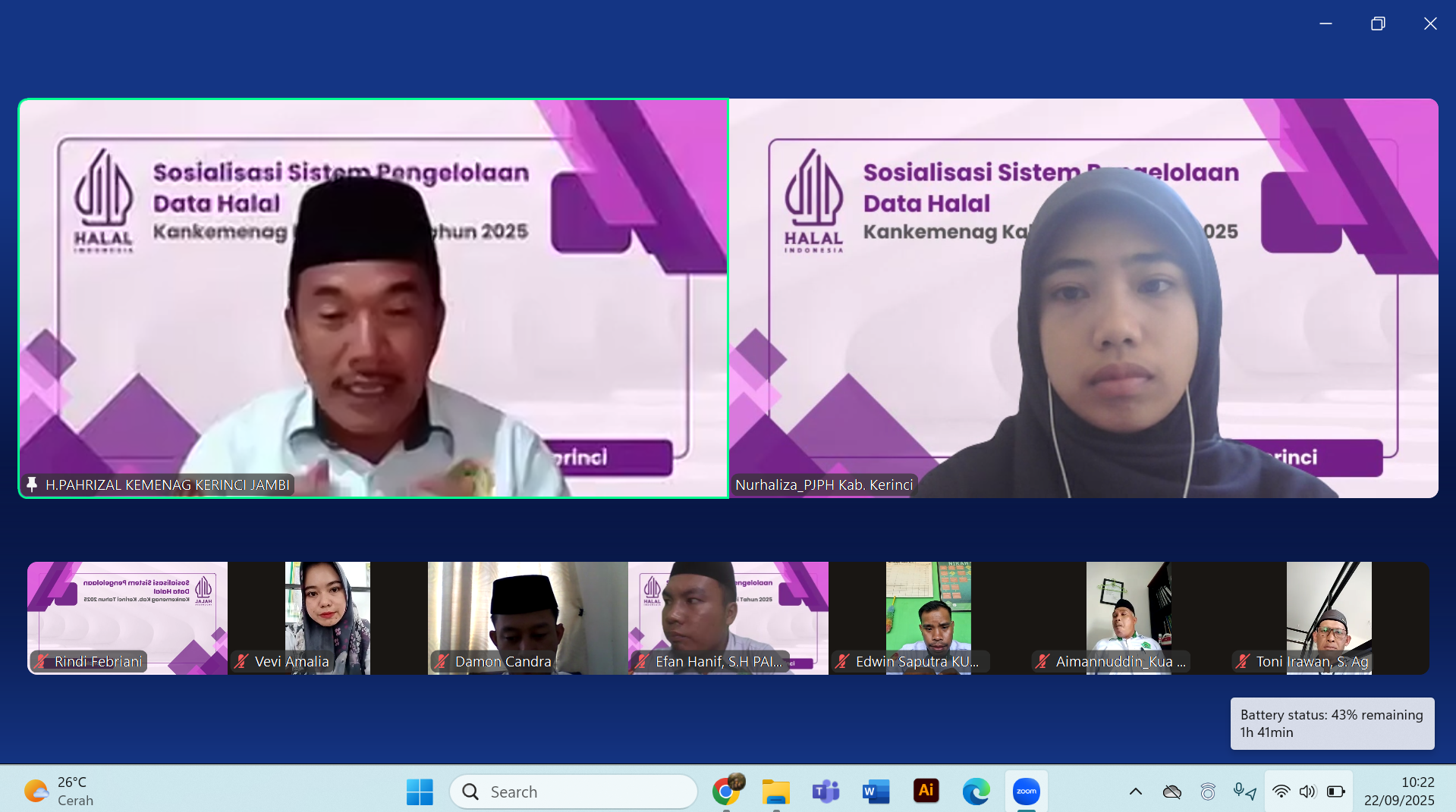 Kemenag Kerinci (Humas) - Kantor Kementerian Agama Kabupaten Kerinci melalui Seksi Bimbingan Masyarakat (Bimas) Islam mengadakan kegiatan sosialisasi sistem digital terbaru bernama KERISH (Kumpulan Elektronik Registrasi dan Integrasi Sistem Halal), Senin (22/9). Kegiatan yang berlangsung secara daring melalui Zoom Meeting ini diikuti oleh para Pendamping Proses Produk Halal (P3H) dari seluruh wilayah Kerinci. Sosialisasi ini menjadi bagian dari upaya penguatan layanan halal serta percepatan pencapaian target nasional satu juta sertifikat halal.