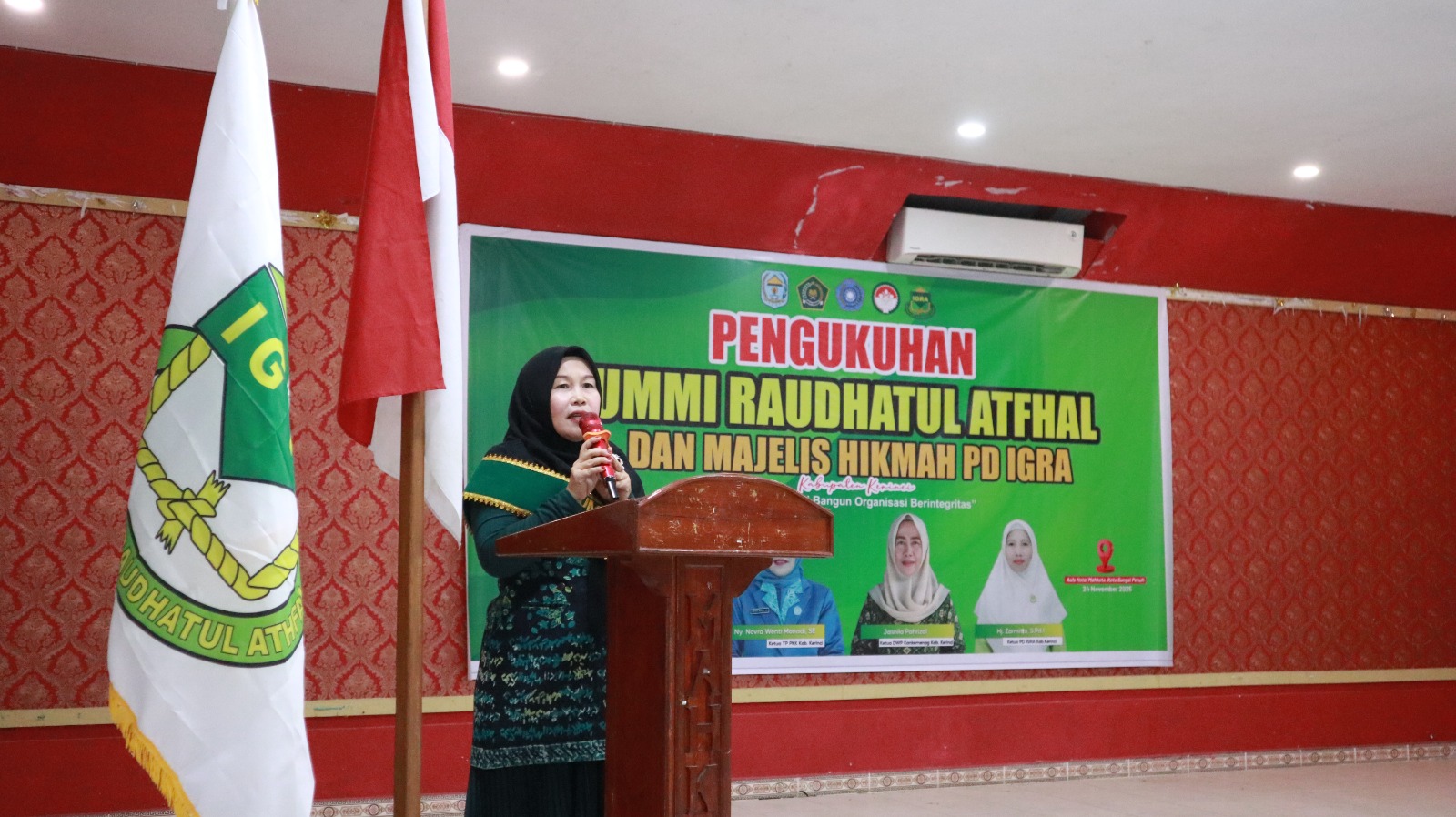 Dalam kesempatan tersebut, Ny. Novra Wenti Monadi, S.E. Ummi RA yang baru dikukuhkan turut menyampaikan sambutan, menyatakan kesiapan dan komitmennya dalam mengemban amanah yang diberikan.