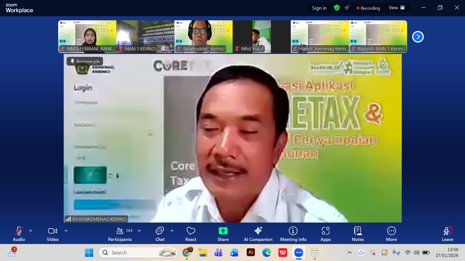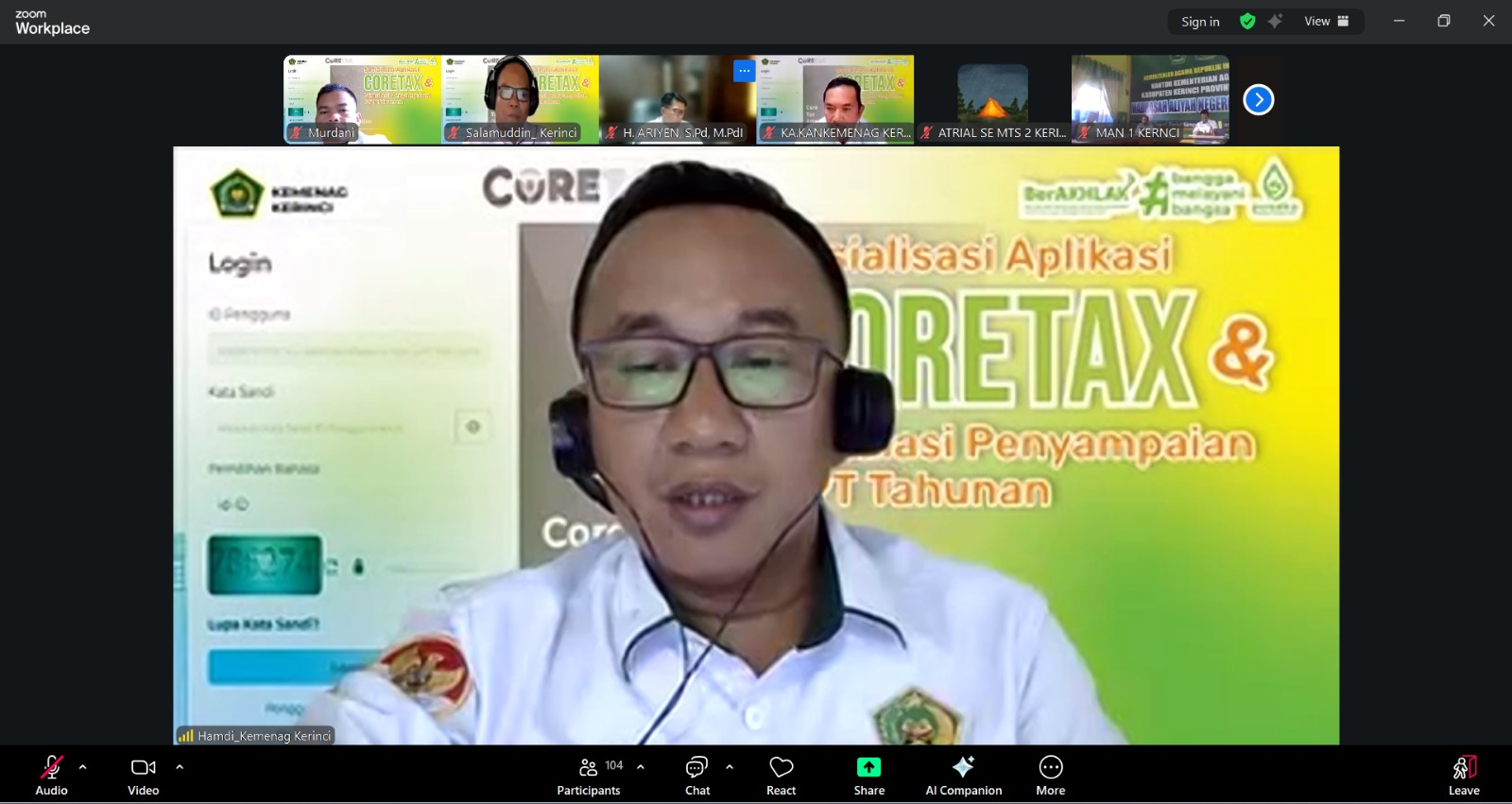 Kerinci (Kemenag) — Dalam rangka mendukung tertib administrasi dan kepatuhan pelaporan perpajakan Aparatur Sipil Negara (ASN), Kantor Kementerian Agama Kabupaten Kerinci menggelar Sosialisasi Coretax dan Simulasi Penyampaian SPT Tahunan secara daring melalui Zoom Meeting, Selasa (27/1/2026) siang.
